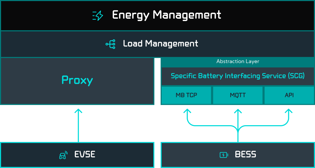 Architecture diagram illustrating how energy management integrates load management, a proxy layer, and a battery interfacing service (SCG) with EVSE charging stations and BESS systems.